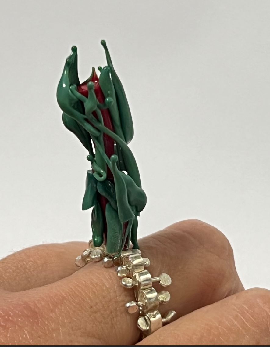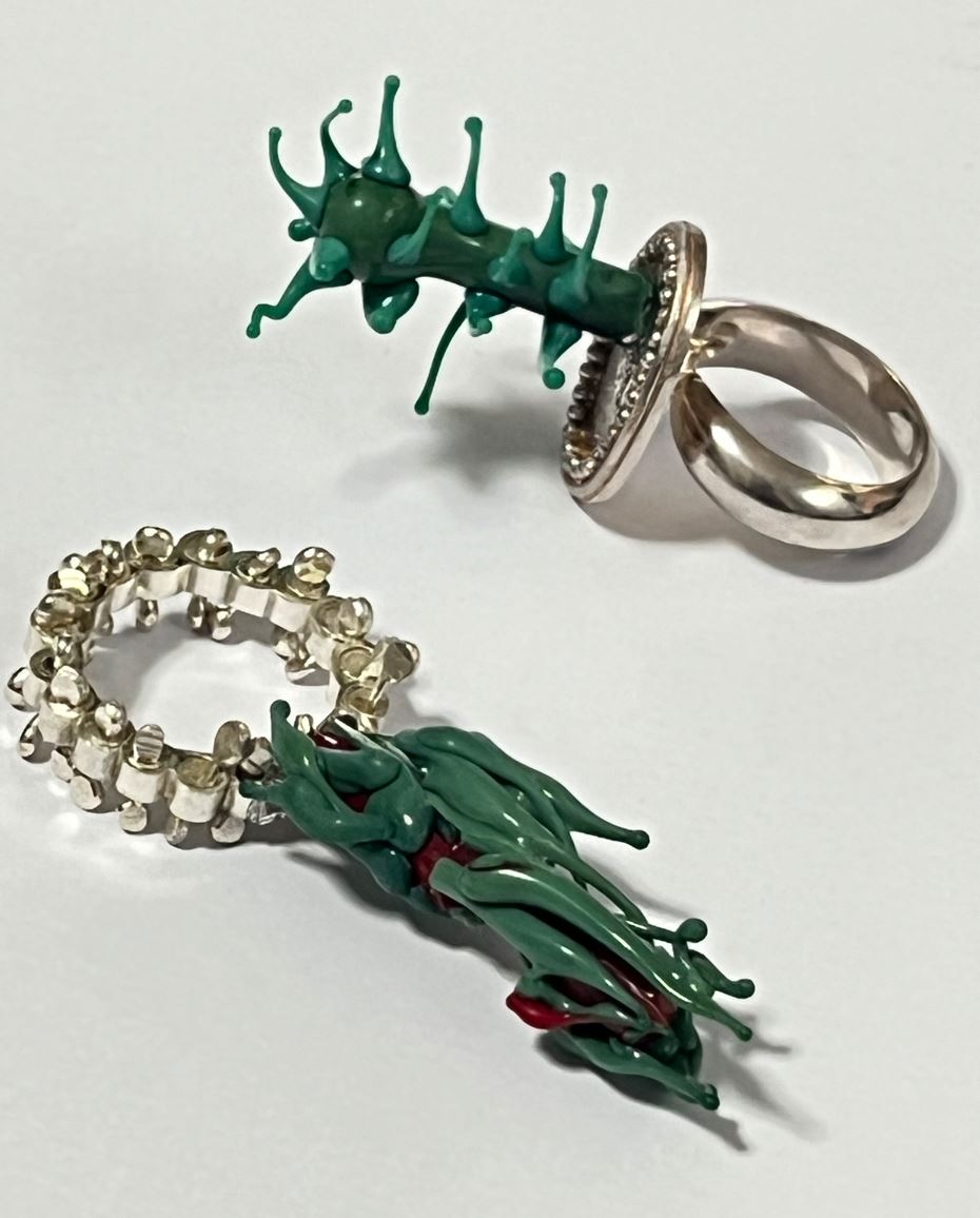 A series of wearable jewellery objects, handmade from glass and silver expand my 30—year research investigation into unique ways to combine two materials. The objects created in concept and design explore breaking, from a number of perspectives, including physically and conceptually.